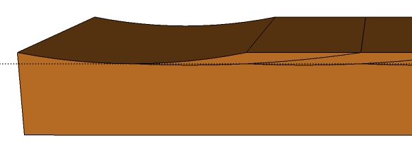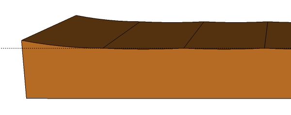| This is a sketchup model of the board after many passes with the scrub plane, each centred on the right edge of the previous furrow. In spite of having a very aggressive set, the resulting board is quite flat. |