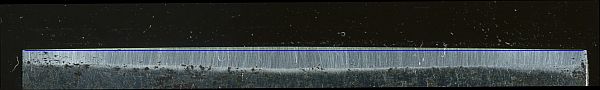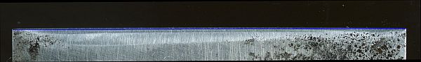 The front view after the 15 micron abrasive at 55 degrees. The micro bevel is pretty clear, especially at the right side. This is a scanned image - control of lighting is much harder with a scanner, but you do get to see the entire tool edge.